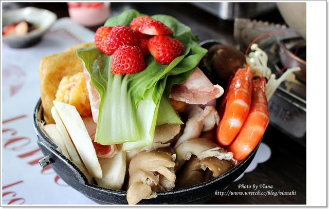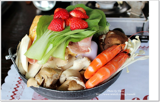 和其它鍋類的菜盤相比,多了兩隻蝦子和上頭的草莓,