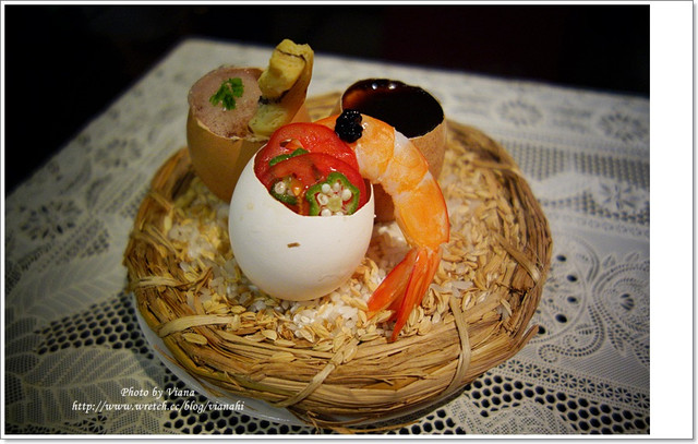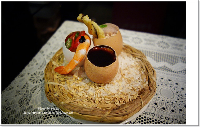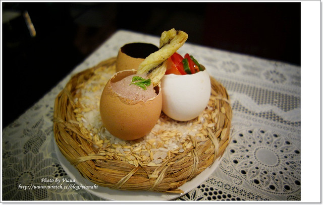 三顆創意風格的蛋放置在鳥巢造型的器皿上,非常特別可愛唷!