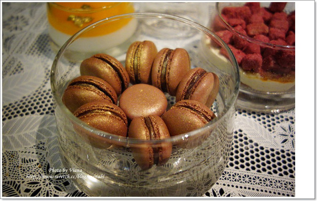 最底層是以巧克力為內餡的巧克力馬卡龍,灑上了30公克價值1500元的閃耀金粉,