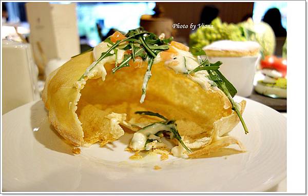 披薩皮吃起來非常地脆,就像薄片餅乾般的口感,上層鋪覆著奶油、燻鮭魚、蔬菜等配料,