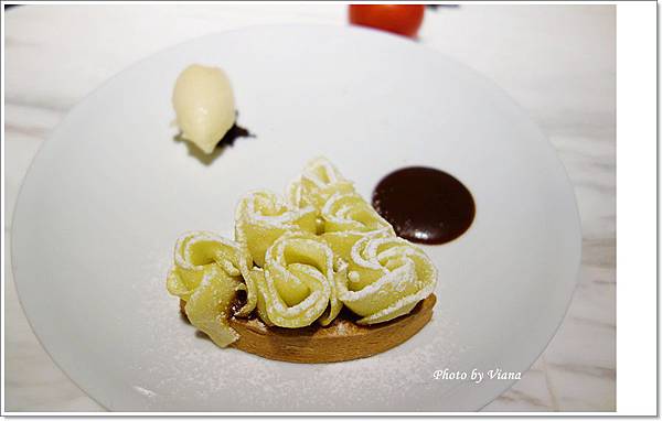 酸甜滋味,灑上糖霜的蘋果,有先處理過,口感偏柔軟,搭配上底層帶有香氣的塔餅,