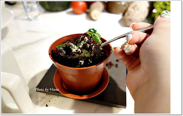 冰冰涼涼的薄荷冰淇淋上頭覆蓋著巧克力酥餅,插上了薄荷葉,真的很像盆栽呢!!