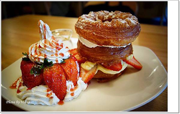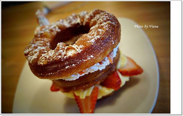 ▼炸過後的可頌甜甜圈,酥香鬆軟,一點都不會覺得油膩,搭配夾層的奶油、卡士達,草莓,