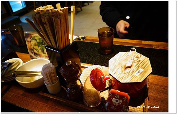 ▼桌上放有餐具、醃製小菜和一些調味粉~