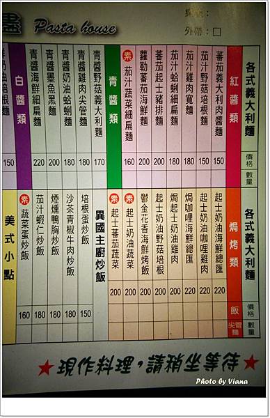 提供有各式義大利麵 (紅醬/ 青醬 /白醬 / 清炒)、焗烤、
