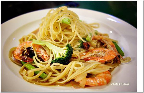 有蝦子、花椰菜、蘆筍,蒜辣香也夠味,