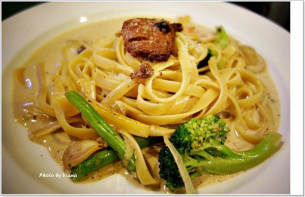 以奶油白醬為底,食材有鵝肝醬、花椰菜、蘆筍,