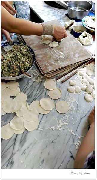 伴隨著韭菜豬肉的內餡,韭菜和豬肉的比例大約一比一,