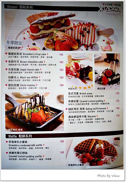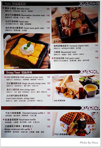 主要提供輕食類餐點,有雪糕系列、鬆餅系列、熱鐵板系列、拉絲系列、咖啡、茶、冰沙等,