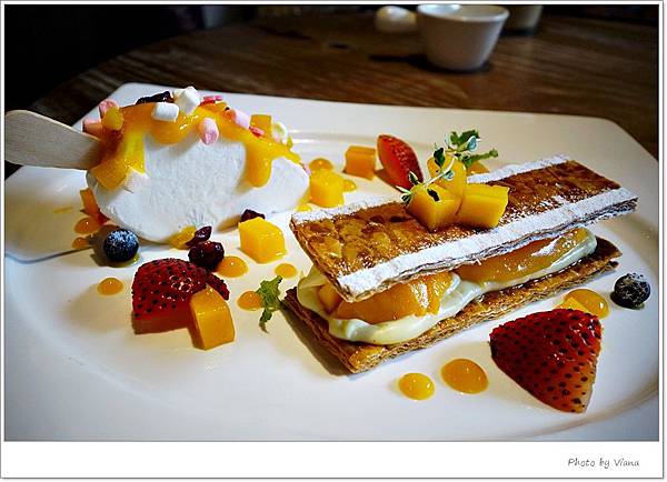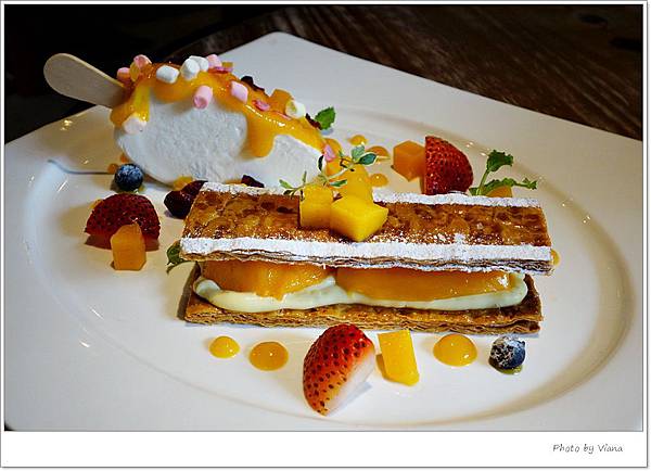 酥脆的千層派餅夾疊著甜滋滋的愛文芒果,以及濃郁不甜膩的卡士達,