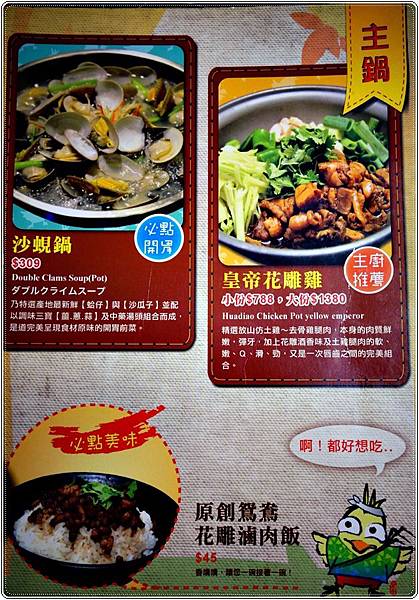 原創花雕雞的招牌料理就是花雕雞,其它還有沙蜆鍋、蔬果高纖鍋、